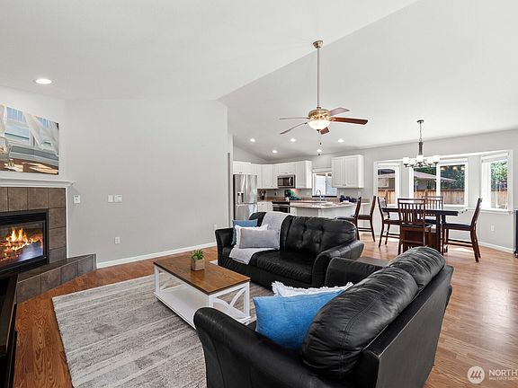 Immaculate 2+ bedroom, 2-bath home offers charm and functionality. Open-concept layout is filled with light from ample windows, showcasing an updated kitchen with white cabinetry and plenty of storage. Living room features vaulted ceilings & a cozy fireplace. Primary suite includes an en-suite bath & direct backyard access, while a second spacious bedroom and closet complete the hallway. Bonus room above the garage serves as a versatile bonus, 3rd bed space for guests or hobbies, with the second bath conveniently located below. Outside, enjoy a covered front porch, fully fenced yard, RV hookup, EV Charger & the peaceful privacy of backing up to Weatherwax. This home combines modern updates with serene setting. Sold Fully Furnished.