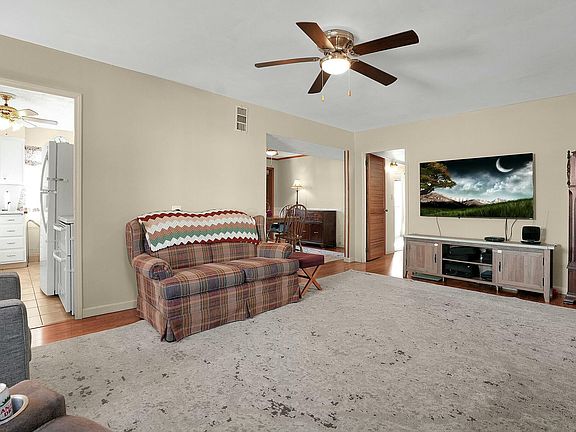 Darling, affordable ranch! Many recent mechanical updates. Enter to a large LR and sitting room/den with WBFP., lighted ceiling fan. Kitchen - all appliances remain, with washer/dryer area. Dining area opens to Owner's Suite w/ lighted ceiling fan, generous closet space. BR #2 has large double closet. Nicely remodeled full bath has tub/shower combination, single sink. HVAC '23, Roof '22, Windows 2020, Deep rear yard with storage sheds. Sale subject to Seller finding suitable housing.