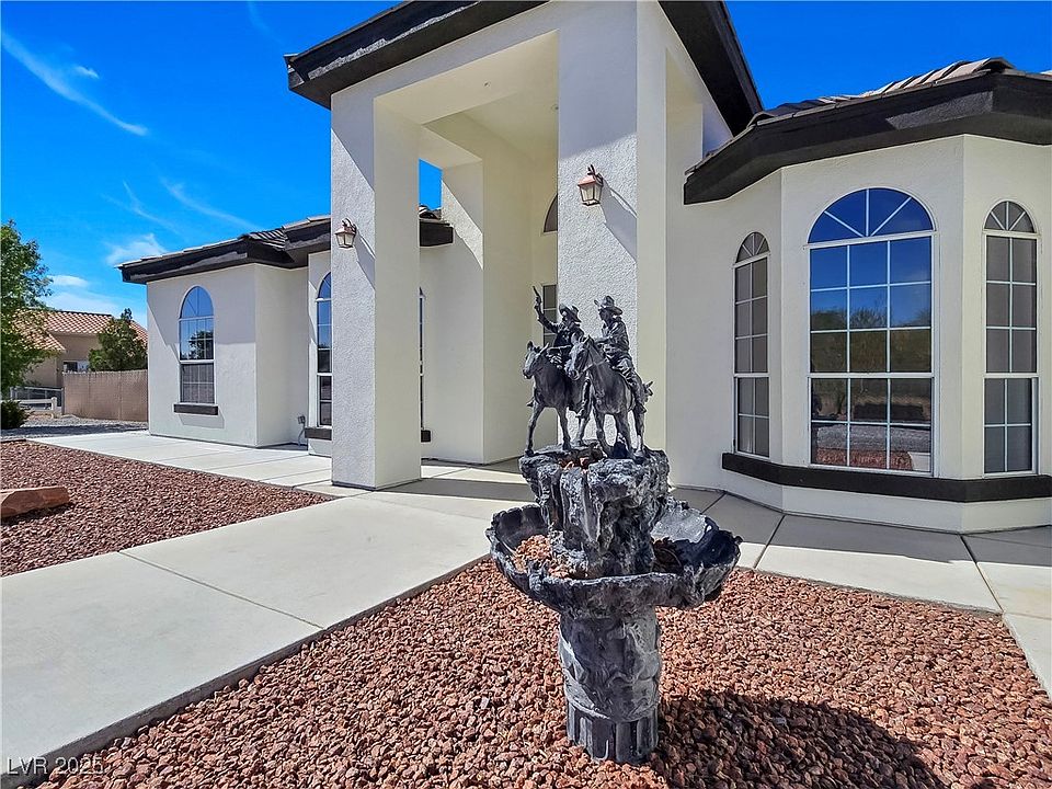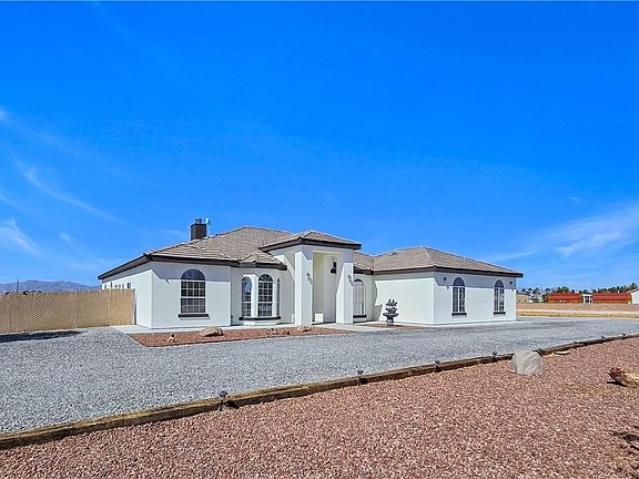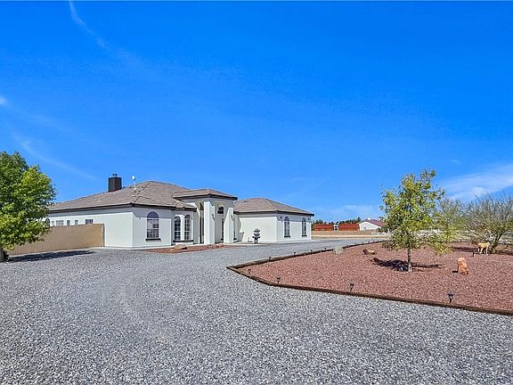 Truly unique semi-custom estate with RV covered parking and hookups! As you enter the home, you are greeted with a dramatic entry with vaulted ceilings and open floor plan. Chef's kitchen is a masterpiece boasting custom cabinets, granite counters, breakfast bar, dining nook, stainless appliances and walk-in pantry overlooking the living room with a wood burning fireplace great for entertaining. Formal living and dining room. Laundry room with cabinets and sink. 4 bedrooms and 2.5 bathrooms. The primary bedroom is showcasing the primary bath with a huge walk-in closet, soaking jacuzzi tub, shower, double sinks and gas fireplace. Oversized 4 car garage with epoxy floors and detached garage that can be converted into a guest house. Resort style backyard oasis with a covered patio w/shades, fruit trees, huge dog run, a gazebo to enjoy the views of Mount Charleston! The whole backyard is completely fenced with privacy fencing. Solar Screens and tinted windows to help with the warm summers!
