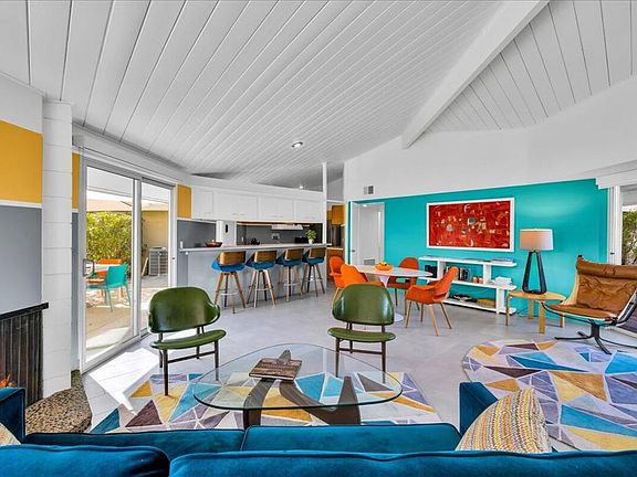 MAJOR PRICE ADJUSTMENT! Welcome to Iconic Da Vaal Estates, often referred to as the original Desert-X! This Midcentury Modern architectural masterpiece is located in the highly sought after Tamarisk Country Club area of Rancho Mirage. The property was designed in 1960 by renowned architect Val Powelson & built by contractor, Robert Marx, son of Gummo Marx. Consisting of five, one-level, 4-unit condominium groupings based on a four-pointed star. There are no common walls. The only point at which these units are attached is at the center of the ''X'' where each unit has a large storage area originally designed to store your golf cart. The space now houses your laundry, HVAC and water heater. The open living plan spans approximately 32ft & features a vaulted tongue and groove ceiling that soars to 14ft! At one end of the triangular floor-plan is a very generous Primary Suite & at the other a guest bedroom & bathroom suite. There are walls of glass and clerestory windows that fill the space with an abundance of natural light. Once a grapefruit orchard, Da Vaal Estates retains original fruit trees on a 2 1/2 acre site with astounding views! The property is listed on the Rancho Mirage Register of Historic Properties which allows you a very low annual property tax base. Taxes are included in the monthly HOA fee. Da Vaal Estates is a Stock Cooperative. Each owner is issued a ''stock certificate'' granting a 1/20th share of the complex with exclusive use of a specific unit