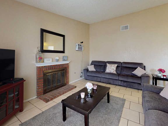 A corner lot that glows with comfort beginning with the green manicured lawns & well kept exterior. Enter upon upgraded tile floors, gaze at well maintained neutrally painted walls, & a warming fireplace with white wooden mantel all perfectly placed in the massive living room. Follow heavenly lights pouring into the home through multiple windows, to the kitchen that is adorned with fresh white cabinets, an upgraded nickel plated faucet, stainless steel and white appliances, & a spacious dining area. Down the hall find an upgraded bathrooms with a new large vanity & framed mirror. Further in find 3 large bedrooms with fresh carpet. The master bedroom has a private bathroom with new wide vanity and framed mirror. The massive backyard has room for a pool & entertainment. It features a covered patio with concrete slab. This home was meticulously maintained & shows well.