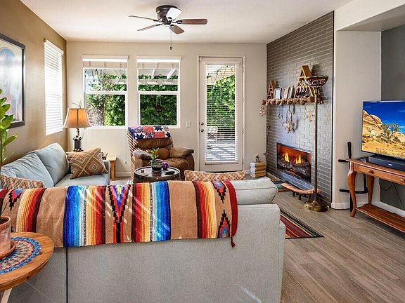 Cozy fireplaceBeautifully landscaped backyardStylish living spaceLarge walk-in closetPrimary suiteWood-like tile flooringOpen floor plan