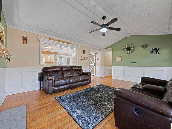 Welcome to your private retreat! This beautifully detailed home sits on 15 serene acres, offering the perfect blend of open pasture and wooded trails. Whether you're looking for a peaceful homestead, a place for animals, or room for extended family, this property has it all. The main level features 2 spacious bedrooms and two full bathrooms showcasing warm character with textured ceilings, crown molding, and wainscoting throughout. The full-length porches on three sides invite you to relax and enjoy the scenic views while the enclosed sunroom on the fourth sides provides a cozy spot year-round. The finished basement doubles as a mother-in-law suite, complete with it's own kitchen and living area-perfect for guests, family, or potential rental income. Outside you will find a detached 3-car garage with an additional lean-to, a chicken coop, and another outbuilding for storage or hobbies. The land is a picturesque mix of pasture and woods, complete with trails for exploring and a large pond that adds to the tranquil setting. Additional features include a camper hookup with water, electric, and gas, making it easy to host visitors or enjoy weekend adventures right at home.