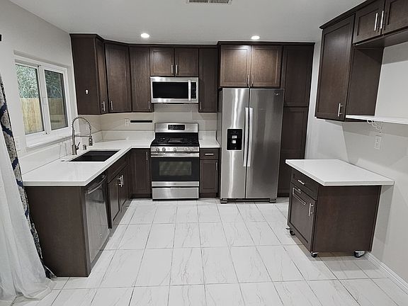 This cozy remodeled 3 bedrooms, 2 bath house includes brand new doors & windows, fully loaded brand new kitchen with refrigerator, built-in microwave, dishwasher, gas range stove, washer and dryer, smart home technology, gas fireplace, new flooring, lighting, and so much more is now available for rent. This property is located in a quiet cul-de-sac and includes a spacious backyard with an x-large covered patio, and a brand-new privacy fence. The property has an attached 2-car garage with additional parking available in the driveway and plenty of street parking. Utilities not included. Section 8 accepted.
