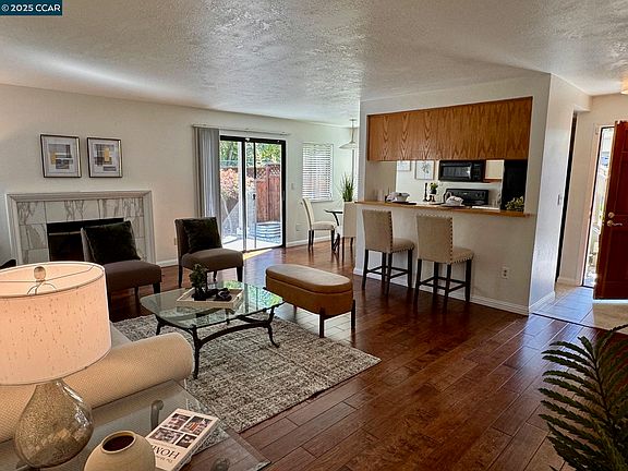 Darling 2-Bedroom/2-Bath End-Unit in Cobblestone. Welcome to this charming, level-in end-unit condominium located in the highly desirable gated Cobblestone community. This home offers a warm and inviting floor plan featuring rich engineered wood flooring, a spacious living room with direct access to a private patio, and a galley-style kitchen complete with a breakfast nook and convenient kitchen bar. Enjoy the ease of an attached garage plus an additional covered carport, providing plenty of parking options. The serene setting includes a beautiful greenbelt, while the recently renovated community pool and hot tub create a perfect retreat just steps from your door. With its combination of comfort, style, and amenities, this 2-bedroom, 2-bath home is an ideal opportunity in one of the area’s most sought-after neighborhoods.