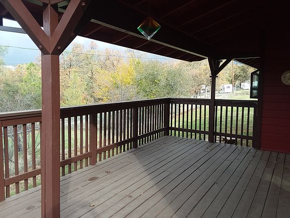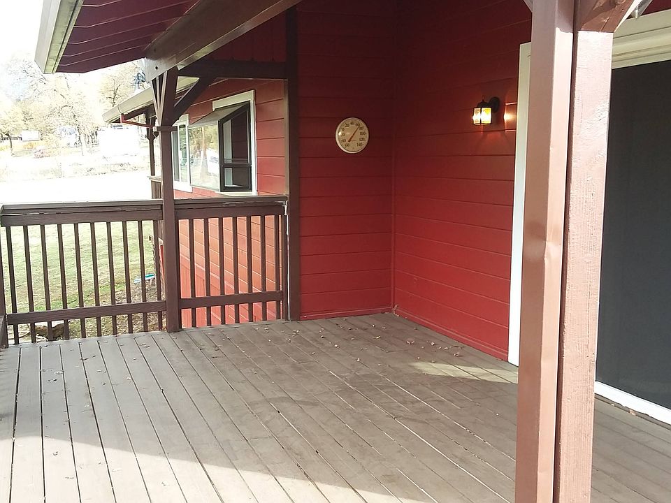 Large windowsOpen floor planDeck for outdoor enjoymentVinyl plank flooringService deckDecorative wood stove