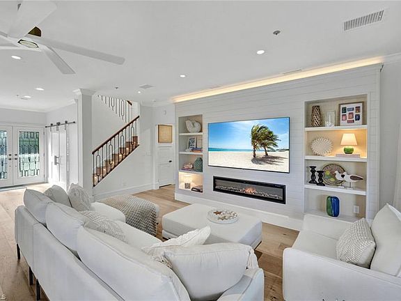 This beautiful lakefront residence is located in the sought-after Cracker Cove neighborhood of Bonita Bay. Completely remodeled with all work fully permitted, the home was redesigned by a top Naples designer and is offered turnkey, fully furnished—ideal as a full-time residence or a luxurious second home. The flexible floor plan features two primary suites, an additional bedroom, and three full baths, providing exceptional privacy for guests and versatile living or work-from-home options. Light-filled interiors highlight the hardwood floors, plantation shutters, and an open-concept design tailored for both everyday comfort and entertaining. The kitchen features quartz countertops, new LG appliances, and generous cabinetry, seamlessly connecting to the main living areas. The upper-level primary suite serves as a private retreat with a spa-inspired bathoom, walk-in closet, and its own outdoor terrace overlooking the lake. A second primary suite on the main level offering equally comfortable accommodations for guests. Additional highlights include versatile bonus rooms, a spacious garage accommodating four to six vehicles, a screened lanai with panoramic lake views, electric hurricane shutters, and a new metal roof (2023). Residents of Bonita Bay enjoy miles of scenic walking paths and a private Beach Club, with the option to join the prestigious Bonita Bay Club, featuring five championship golf courses designed by Arthur Hills and Tom Fazio, tennis and pickleball facilities, an elegant clubhouse, and a 60,000-square-foot lifestyle and fitness center. Combining furnished turnkey luxury, breathtaking lakefront views, and world-class amenities, this residence delivers an elevated Bonita Bay lifestyle.