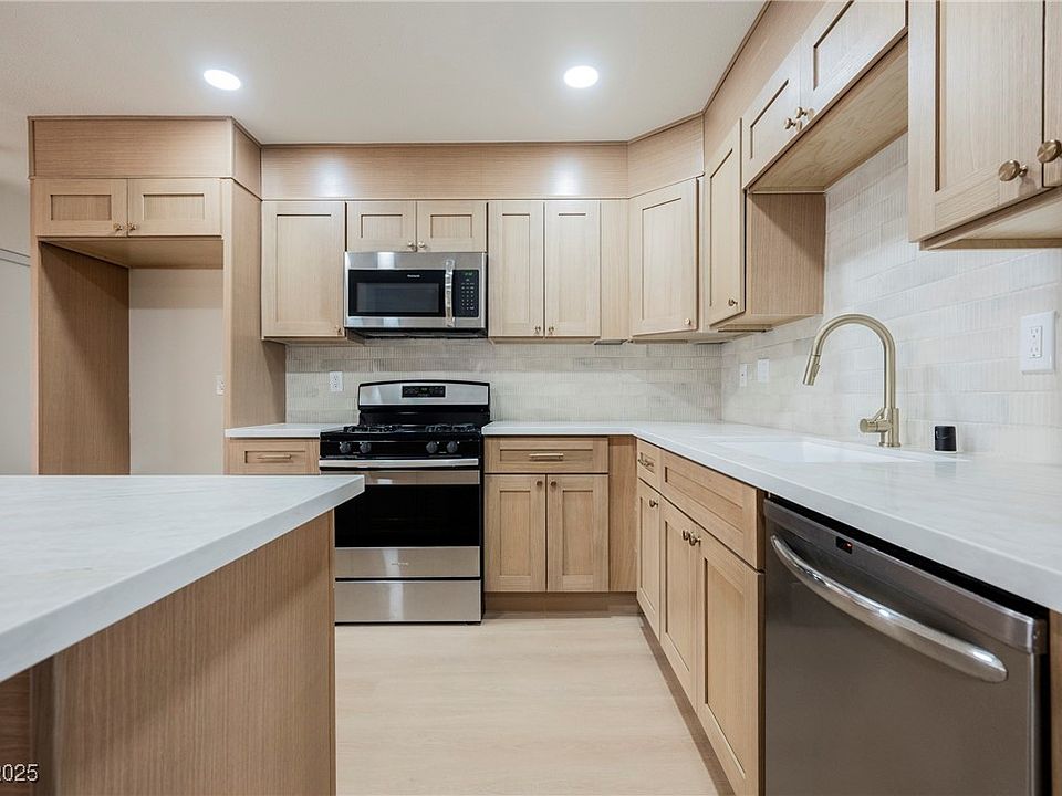 Discovery sanctuary in this exquisitely upgraded abode on the glamorous northeast Las Vegas. Step inside to space adorned by inviting paint tones, premium plank flooring, and lovingly curated fixture package featuring brass lighting and knurled hardware. The island style kitchen is a true delight showcasing rich two-tone cabinetry that’s anchored down by gorgeous quartz counters, and stainless steel appliances. Retreat to a primary suite paired with an en-suite bathroom equipped with a walk-in shower finished in bespoke tile. Outback enjoy low maintenance landscape and artificial grass. Schedule your private showing today!