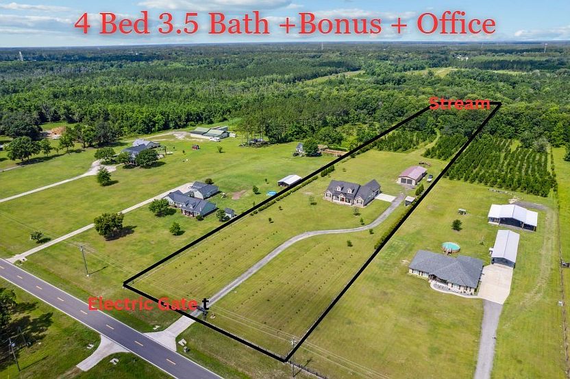 New 2024 Build on PRIME 7.12 ACRES! Conveniently located in the Country! Electric Gate Entrance! 3,031 Heated Sq Ft! 4 BEDROOMS, 3 1/2 BATHS, BONUS ROOM (could be 5th Bedroom) + OFFICE with built ins. Kitchen- SUB ZERO Refrigerator, BOSCH Dishwasher, WOLF Gas Range and Double Ovens, Built In Microwave and Ice Maker in Island. Reverse Osmosis, Water Softener, Gas Fireplace, Tankless Gas Hot Water Heater. Laundry offers new washer, dryer, stand up freezer and sink. PLANTATION SHUTTERS & REMOTE SHADES. Spray Foam in Attic, Extra Insulation Inside. Back Porch has hookups ready for TV, Sink, Gas to design your outdoor kitchen. Want a pool? There is plenty of space and hookup is in place. 2 Car Attached Garage with SHARK COATING and STORAGE Closet. Whole House Generac! Irrigation! 30x50 Workshop 2 Roll Up Doors! with electric and plenty of storage! THE BEST part is walking down the hill to the flowing stream. You can feel the temperature drop surrounded by MATURE OAKS and NATURE!