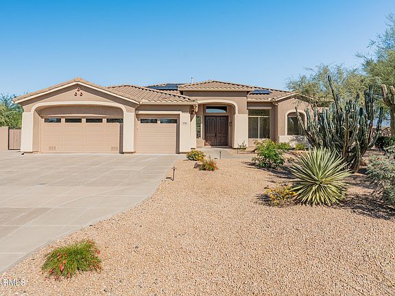 This stunning property captures the essence of Arizona living - space, privacy & natural beauty all in one. Set on a 1.3+ acre lot surrounded by mountain views and unforgettable sunsets, this meticulously maintained 2600 sqft single-level home won't disappoint. Featuring 4 bedrooms, 2.5 bathrooms, and a 3-car garage, the thoughtful floor plan balances comfort and versatility. The chef's kitchen boasts granite countertops, convenient center island, stainless appliances, gas cooktop, ample cabinetry, and a walk-in pantry - perfect for both culinary enthusiasts and entertainers. The oversized primary suite offers a true retreat, complete with a sitting area, private backyard access, and a custom walk-in closet. The large ensuite bath features a jetted soaking tub, walk-in shower, and dual sinks. Step outside to your private backyard oasis, designed for relaxation and gatherings. Enjoy the recently remodeled pebble tec pool, built-in gas BBQ, and covered patio, ideal for morning coffee or evening cocktails under the stars.