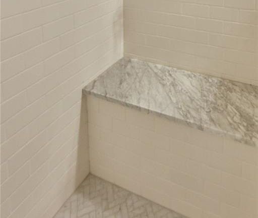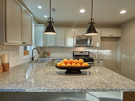 Breakfast barGranite countertopsStylish backsplashLight gray cabinetsMarble bathDesigner kitchenStainless steel refrigerator