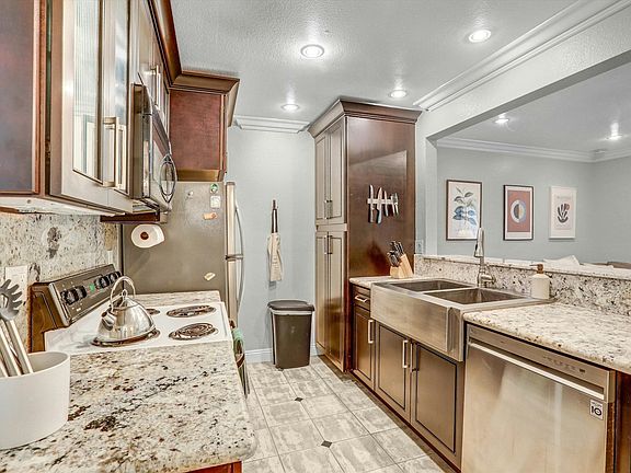 Thoughtfully updated with a spacious open layout and tile floors throughout. Kitchen features granite countertops, breakfast bar with 2 bar stools, and is fully stocked with service for 4 people. Appliances include fridge, stove, microwave, dishwasher, coffee maker, pots and pans.