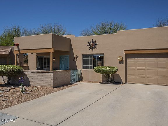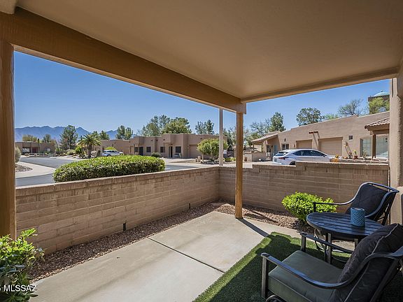 Spectacular Santa Rita Mountain Views from this furnished 1 Bedroom, 1 bath Townhome w/1-Car attached garage + 2-car driveway situated on an East facing lot off a semi cul-de-sac in the Gated community, The Springs, next to Torres Blancas Golf course! Front covered patio welcomes you to the open concept kitchen, living & dining areas. Bedroom suite has a large walk-in closet & an updated bathroom. Ceiling fans. Skylights to bring in natural light. Custom kitchen countertop. Tile & carpet flooring. New Trane HVAC in October 2024. Washer & dryer stays. Gated/Walled Back Patio with astroturf & a grill + outdoor furniture stays. Numerous amenities nearby at the Santa Rita GVR rec center Inc pool, fitness & 1-mile walking trail + Shopping, Restaurants and Golf nearby!