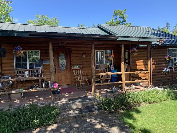Log home covered front porch Southern sunny exposure. Three outbuildings. Home has Vinyl windows. Excellent Snaplock metal roof, log siding, back deck with fire pit. Chicken coup. Flat usable land on top around home and sloped in back down to fence line. Ductless heat pump Heat and air conditioning. Updated electrical panel.Permitted wood stove. Electric heaters, Generator plug in and ez breaker switch over for electric. standard septic, Newer well pump and pressure tank installed by KC Jones well/Rainbow pump. updated kitchen Refrigerator oven range included. All appliances in home are included. Well water tastes great. Carpeted bedrooms .Nice bathroom w shower over tub. Inside utility room washer dryer included. Hot tub included. Seasonal creek on land below. Close to Jasper park, Elijah State Park 847 acres horse and picnic Biking trails horse riding, trails, fishing on Middle Fork of Willamette River minutes away, Fall Creek dam, Dexter lake, Look out dam is close by. 20 minutes to Down town Eugene.