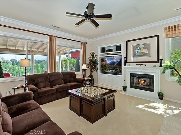 The quiet serenity of this beautiful home is something to savor. Golf course frontage with a panoramic view of the mountains in the background. A private pool and spa, a tiki bar with barbecue, a putting green, and a private front patio with a fireplace all bring a sense of fun and closeness for family and friends. Inside, a large living room and dining room are light and bright with skylights and open into the "California Room" for games or extra family activities. The separate family room opens to a large kitchen with an island and separate eating area. There is direct access from the garage into the kitchen. On the opposite side of the house are all of the bedrooms. The primary bedroom has an electric fireplace, walk-in closet, and large bath with dual sinks, and separate shower and jetted tub. Three other bedrooms and two baths complete this wing. The 4th bedroom has been converted into an office, but comes equipped with a "Murphy Bed" to accommodate extra overnight guests. This home is ready to move in and comes mostly furnished per seller inventory. Included is a water purifying/filtration system, solar panels (owned, not leased), gas generator, rain gutters, and spacious 3 car garage. Meticulously maintained, this luxurious environment could be yours. Truly a special home. Don't miss it!