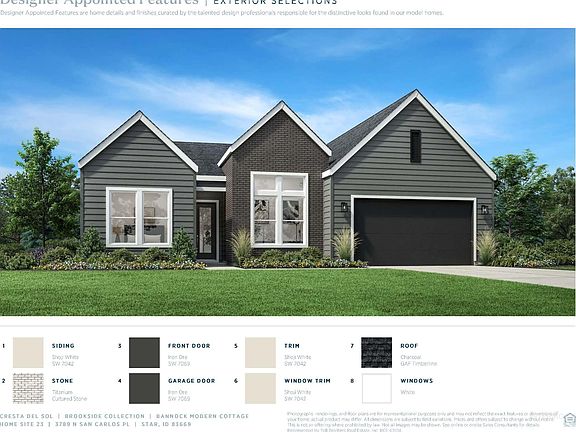 "The Bannock" exudes contemporary comfort and functionality, exemplified by its thoughtfully crafted single-story layout. A long foyer sets the stage, leading to a spacious great room seamlessly connected to the kitchen, casual dining area, and covered patio—an ideal setting for gatherings and relaxation. The kitchen is centered around a striking large center island and enhanced by its expansive walk-in pantry. The primary bedroom suite, nestled in the rear of the home, features a serene sanctuary complete with a luxurious walk-in closet and a primary bath with separate vanities, and a luxe shower. Off the foyer, two secondary bedrooms and a bathroom offer privacy and comfort, while a versatile flex room and powder bath round out the home. 4 car garage. BTVAI