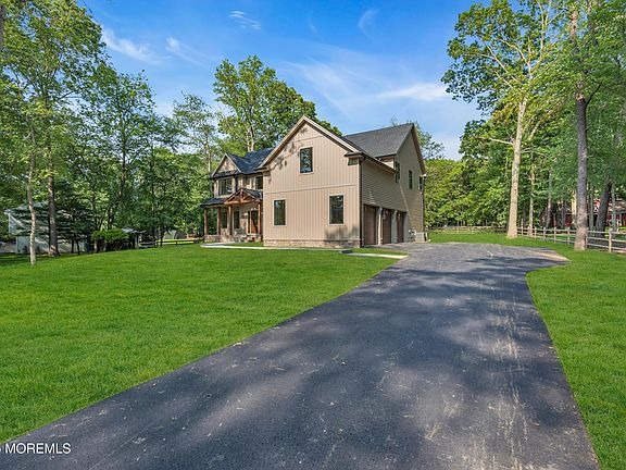 Impressive new construction with quality custom finishes on 1.33 private acres in rural Howell Twp. This gorgeous 3,441 sq ft home is just 20 minutes to Jersey Shore beaches, offers a 3-car garage and a huge basement with insulated, sheetrocked ceilings and Superior Walls foundation—ready to be fully finished! The chef's kitchen shines with quartzite counters, large center island, stone accent wall, custom cabinets, pot filler, range hood, and butler's pantry. Features include a 1st-floor bedroom & office, hardwood floors throughout, upstairs laundry, covered slate porch, and large backyard. Enjoy frameless glass shower doors, a high-efficiency Heatilator wood-burning fireplace, 2-zone HVAC, smart tankless water heater, Generac generator, Ring security, pre-wired for ethernet & speakers!