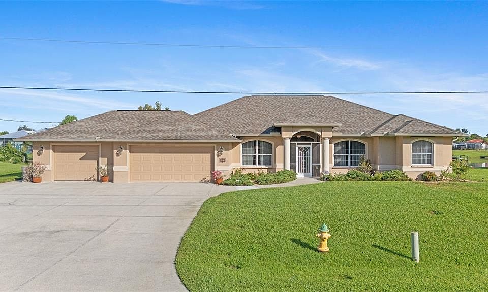 Step inside this beautiful, extremely well maintained, custom 3/2 lakeside home situated on 2 lots in Port Charlotte on a very low traffic street across from a designated green space park, several acres in size that will never have homes built on it. This home is a rare find and one that has everything that anyone could ever want in a home - and more. The owner was a custom home builder and built this home to live in and spared no expense doing so. From the oversized 3 car garage/workshop, monitored security alarm system, intercom/audio system with speakers in most rooms, large walk in laundry room with storage galore and a mini refrigerator, heated in ground swimming pool, automatic propane powered whole house generator (in case of any power outage), accordion easy pull exterior storm shutters, granite counter tops, chefs kitchen with updated stainless appliances and a large walk in pantry, deluxe jacuzzi tub and walk in showers, new septic system, new roof, new pool cage, an outdoor stove, large private bedrooms with a sitting area in the master, aquarium glass view of the lake from the kitchen, large dining room and family room with built in storage, as well as a separate living room, tons of storage and closets throughout, large walk-in attic storage above the three garages- it even has a private office with etched glass doors. There are simply too many great features to list. This one has it all! Truly a one-of-a kind home and one that won't last long. Come see it today. It a spotless turn key move in ready home.