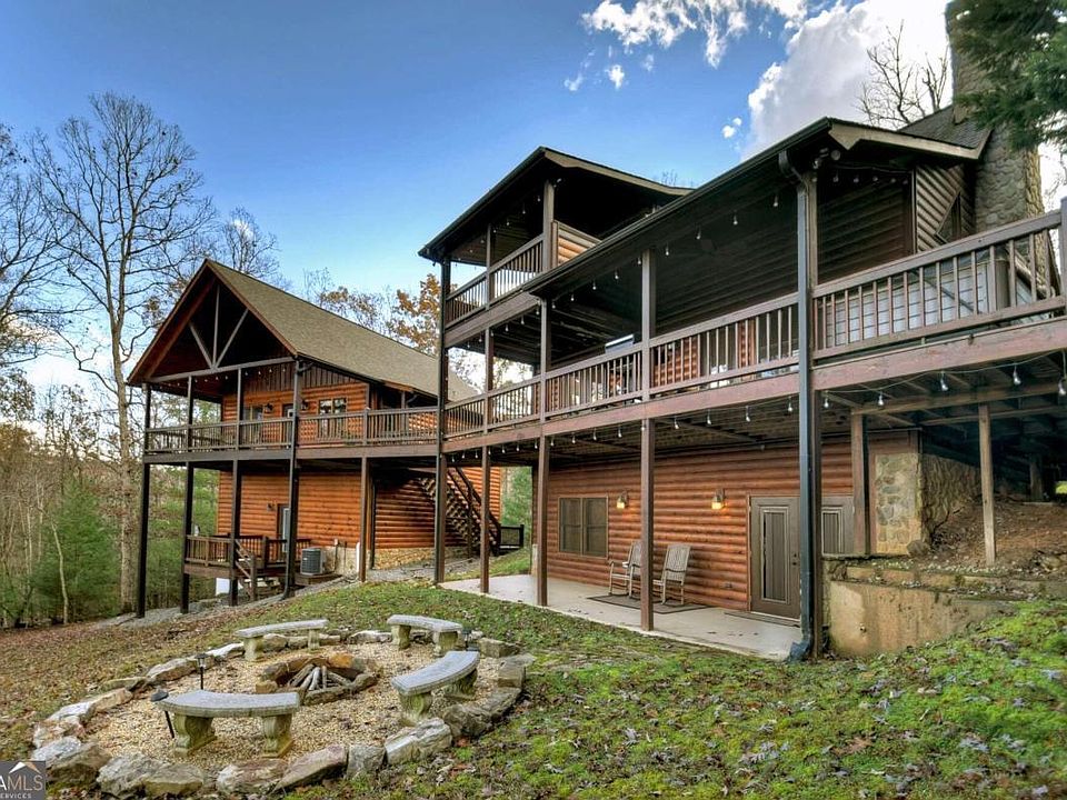 Escape to mountain bliss in the heart of the North Georgia Mountains with this stunning rustic timber lodge compound overlooking layered mountain views and a serene setting only minutes to Lake Blue Ridge and Historic Downtown Blue Ridge -- welcome to the Robinson Thomas Lodge! Complete with a main cabin and additional guest house, the property is comprised of four bedrooms, four full bathrooms, two kitchens, two large living areas, sprawling outdoor decks, terrace level billiards room, additional large sleeping loft in guest house, and a full theatre! Walk-out basement leads to a gentle backyard and fire pit with wide-open mountain views. Detached guest house has a full two car garage and workshop beneath with ample storage for the necessary mountain toys! Kitchen complete with granite countertops and rustic cabinetry. Stone fireplace adorns the main house living room and beautiful hardwood floors. Sold fully-furnished, conveniently located all while privately tucked away on a lush mountain lot, this lodge won't last long. Call today for an exclusive tour.