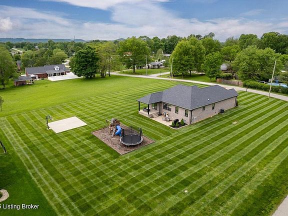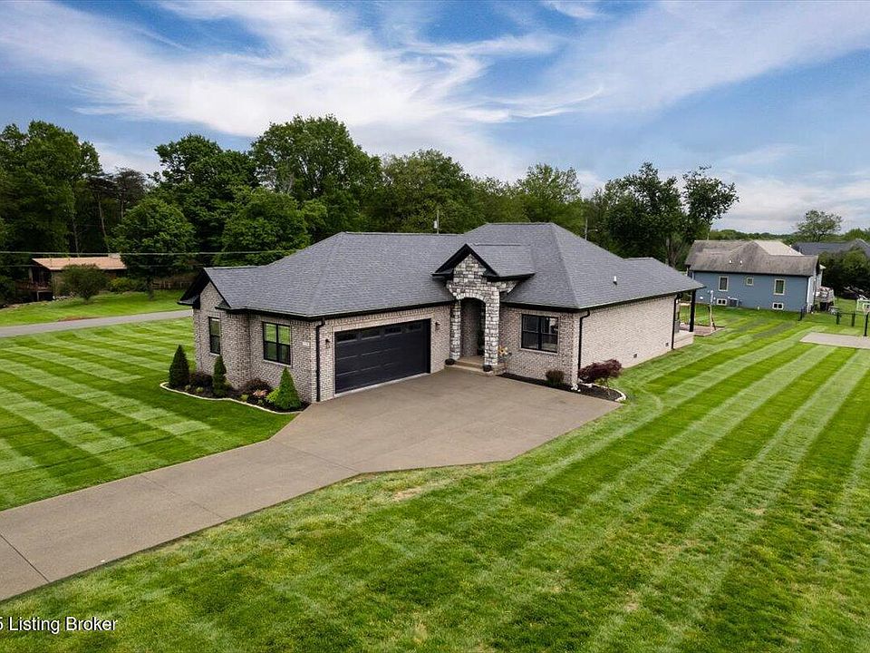 Welcome to this beautifully designed ranch-style home where modern elegance meets everyday functionality. From the moment you enter the dedicated foyer, you're welcomed by soft neutral walls and stunning floors that flow seamlessly throughout the main living spaces. Soaring ceilings and an abundance of windows fill the home with natural light, creating a warm and open atmosphere. The heart of the home features a striking black board and batten accent wall that plays off the black tile kitchen backsplash, providing dramatic contrast to the white cabinetry and white stone countertops. Stainless steel appliances, a large single-basin farmhouse sink, and an inviting eat-in dining area complete the kitchen. Just off this space, you'll find a gorgeous covered patio—perfect for outdoor dining or entertaining with an additional uncovered area for added flexibility. The primary suite is a relaxing retreat, offering tray ceilings, generous natural light, a spacious walk-in closet, and a spa-like bathroom with a double bowl vanity, a glass-enclosed shower, and a luxurious soaking tub. Two additional bedrooms share a well-appointed full bathroom. A separate laundry room and a mudroom with built-in cubbies provide added convenience and organization potential. The two-car garage includes a durable epoxy floor finish, and a double-width driveway with an oversized parking pad adds extra space for guests or recreational vehicles. The exterior combines light brick and stone with black-framed windows and a sleek black roof for standout curb appeal. Set on a huge, flat, and usable 0.9-acre lot, the backyard is a dream featuring a poured concrete basketball court with an installed goal, a mulched playground area, and plenty of green space to roam, garden, or gather. Located in the sought-after Hebron Estates neighborhood of Shepherdsville, this home offers the perfect blend of peaceful suburban living and convenient access to local amenities. Families will appreciate the proximity to Freedom Elementary School, Hebron Middle School, and North Bullitt High School all within a short distance. Outdoor enthusiasts can enjoy the nearby Shepherdsville City Park, a 114-acre space featuring pavilions, playgrounds, and walking trails . Additionally, the city's new state-of-the-art Aquatic Center and all-inclusive playground provide excellent recreational options for all ages . With easy access to shopping, dining, and major highways, this location combines the charm of small-town living with the conveniences of the city.