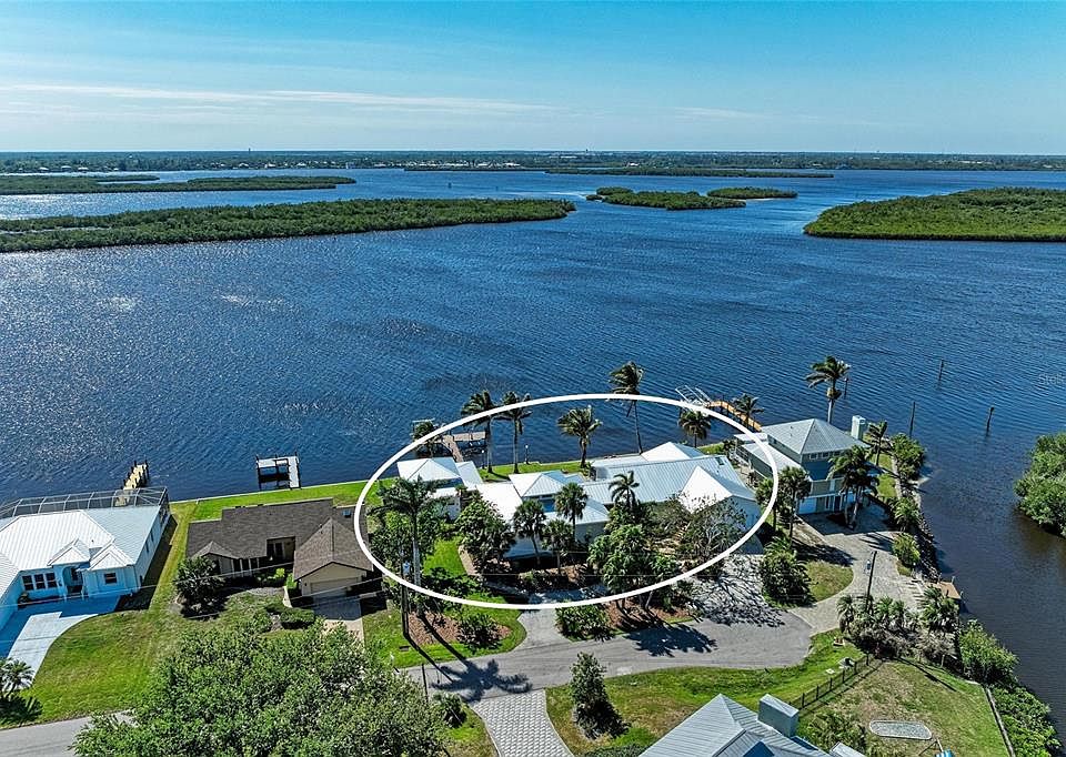 Imagine a waterfront retreat on over 1/2 acre on the Peace River with AMAZING VIEWS, GREAT PRIVACY, & UNOBSTRUCTED water access to the Gulf with BOTH A PRIMARY HOME WITH 3 BEDROOMS & 3 FULL BATHROOMS & A GUEST HOUSE WITH 1 BEDROOM, 1 BATHROOM & FULL KITCHEN/DINING ROOM all overlooking the incredible pool/spa and fire pit area and dock. From the street, feel transported to the islands with the Florida architecture of this elevated home that has not flooded, with a metal roof and great hurricane protection. Inside the main house, warm hardwood floors and great natural light beckon you inside. The kitchen with breakfast bar & upgraded appliances including a WOLF stove is open to the large dining room and living room with built ins and cathedral ceilings. An entire wall of French doors opens to the large covered porch overlooking the water. Off to the left, enjoy two separate guest suites, each with full luxurious bathrooms. Farther down the hallway, a spacious laundry room is centrally located. Enjoy a separate office area with private porch and entrance, great for working from home, and then an INCREDIBLE PRIMARY SUITE, also with separate entry and private porch overlooking the waterway, 3 walk-in closets, a beautiful 2 story ceiling with cupola windows, and an en suite bathroom with separate jacuzzi tub and Roman shower. The main house has a large 2 car garage with workshop. Out back, the resort-like pool area is incredible with a newly finished heated pool/spa with Pentair remote control system and all new pool equipment, a separate fire pit area, tons of room to relax and unwind, and a great walkway to the dock with a boat lift, a jet ski lift, and awesome fishing! The yard has a separate well for landscape watering and dock water. The guest house is connected to this space but has a separate entrance from the driveway, and a huge, covered porch with outdoor kitchen built in with sink, gas 36" grill with side burners and griddle and an extra-large kamodo style green egg grill, a beverage center and eating space. Inside the sliding doors to the guest house, enjoy a lovely open concept with amazing views from each room. The kitchen/living room/dining room are open and overlook the water. Granite counters, upgraded cabinets, commercial grade appliances and great lighting note the finer features of this space, and a large bedroom and full bathroom with tiled shower make this space an amazing feature to this grand property. Note that the dining room table here is also a pool table with hidden storage in the bench for sticks. The property has so much to offer and has been used as a retreat for wellness and is incredible in every way, where sellers have entertained 100 guests comfortably! Priced to sell, with furniture/furnishings available separately, this home has it all and while tucked away, is nearby to great shopping, restaurants, golf, I-75, PGD airport and more! BE SURE TO CLICK THE FULL VIRTUAL TOUR LINKS FOR DETAILS!