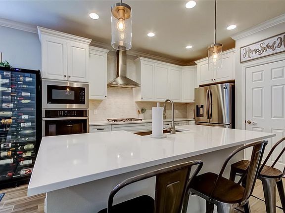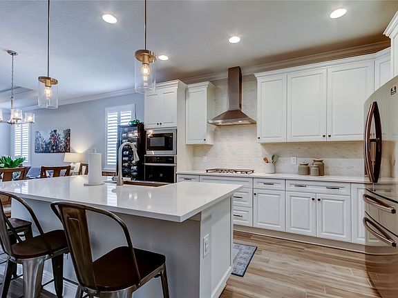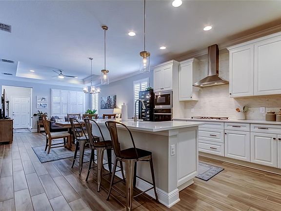 Welcome to your 3 bed / 2 bath / 2 car rear-load garage Craftsman-style home in the sought-after master-planned community of Starkey Ranch in Tampa Bay! Designed with premium upgrades throughout, this residence offers both timeless style and modern functionality. The heart of the home is the gourmet kitchen, showcasing 42” Alpine White soft close cabinetry with crown molding, a gas cooktop, built-in wall oven and microwave, a dramatic chimney range hood, and quartz countertops that carry seamlessly into the primary bath. A farmhouse sink and full tile backsplash extended to the ceiling add to the elegant finish, making this kitchen as functional as it is beautiful. Thoughtful details continue with crown molding throughout, wide 5 ¼” colonial baseboards, plantation shutters on the windows, recessed lighting in the living areas, and an upgraded flooring package that includes level 5 tile throughout the foyer, family room, kitchen, utility, baths, and flex space. Bedrooms feature plush upgraded carpet with enhanced padding for comfort. The primary suite is a true retreat with a spa-like bath, highlighted by designer wall tile, a Carrara shower floor, and quartz countertops. Additional upgrades include a tray ceiling in the family room for architectural character, a screened-in lanai for enjoying the outdoors in comfort, a fully fenced backyard perfect for pets and play, a soft water loop for convenience, and pull-down attic stairs in the garage for extra storage. Set on a rear-garage lot with brick paver driveway, stone-accented elevation, and timeless Craftsman details, this home offers both curb appeal and practicality. With Cunningham Lake and Albritton Park around the corner, you’ll have nature, a community pool, and playground just minutes from your door. Living in Starkey Ranch means access to an unmatched lifestyle: 3 community pools, playgrounds, 20+ miles of walking/biking trails, dog parks, community garden, kayak lake, and year-round activities led by a full-time director. Enjoy Starkey Ranch K-8 STEM Magnet School, public library, theater, and District Park with fields for every sport. Shopping, dining, entertainment, the airport, and Gulf beaches are all within 30 minutes. This meticulously upgraded home combines space, style, and location — a perfect opportunity to enjoy the very best of Starkey Ranch living.