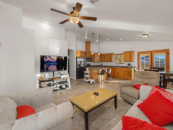 This well-kept, like-new 2021 home features 3 bedrooms and 2 bathrooms within 1,188 sq ft and includes vaulted ceilings, a tile roof, tile flooring throughout, an extended upgraded back patio, a 2-car garage, beautifully upgraded landscaping with synthetic turf, pavers, rock, landscape lighting, and additional concrete for extra parking, plus a refrigerator, washer, and dryer included, along with financed solar panels at $128.65 per month—showing true pride of ownership inside and out.