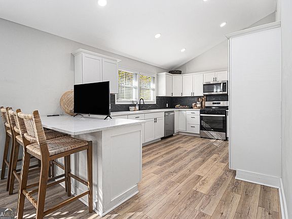 Welcome to 3795 King Edward Trail SW, a completely renovated home nestled in a quiet and desirable Atlanta neighborhood. This home has been completely renovated from the studs up, offering a true like-new living experience. It features soaring vaulted ceilings, sleek quartz countertops, stainless steel appliances, and modern recessed lighting throughout. Every major component has been replaced, including new plumbing, electrical, gas lines, LVP flooring, bathrooms, kitchen, drywall, HVAC system, interior and exterior paint, fireplace, gutters, roof, windows, doors, blinds, porch railing, and deck. This spacious residence offers the perfect blend of comfort, style, and functionality. Step inside to find an inviting open floor plan with abundant natural light that enhances the warm and welcoming atmosphere. The main level features a generous living area with a cozy fireplace, ideal for both relaxing and entertaining. The kitchen is equipped with modern appliances, ample cabinet space, and a breakfast area perfect for casual dining. The primary suite offers a peaceful retreat with a large walk-in closet and a private ensuite bath. Additional bedrooms are well-sized and versatile for guests, family, or home office needs. Outside, the private backyard and deck create an ideal setting for outdoor gatherings and quiet evenings. The backyard provides endless possibilities-perfect for a pool, an ADU or tiny home for additional income, or your own private outdoor retreat. Conveniently located near shopping, dining, parks, and major highways, this home combines suburban tranquility with easy access to all that Atlanta has to offer.
