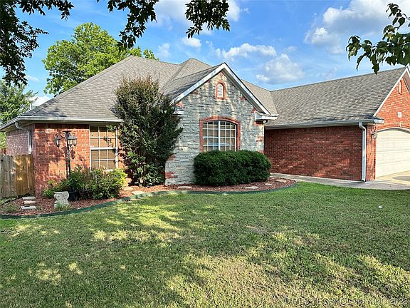 Come see this beautiful Stone and Brick 4 bedroom home in the Lakes of Southridge. The home sits on a corner lot with sidewalks wrapping the front lawn and side lawn. The inviting front entry door is flanked by side lights on both sides providing a well lit entry hall way. The extra wide entry hall opens up to a large living room with a gas fireplace topped by a beautiful mantle for decorations. There are large windows on both sides of the fireplace. The living room has a full tray ceiling with crown molding and a ceiling fan. The adjacent kitchen has a long bar along the living room side. The kitchen includes an large breakfast area and a very large walk in pantry. Across the entry hall from the kitchen and living room are French doors leading into a formal dining room/office/or 4th bedroom. The entry hall also features a large hall closet and next to it a laundry room enroute to the garage. The master bedroom suite includes a tray ceiling, crown molding, a ceiling fan and french doors into the master bathroom. The master bathroom features a jetted tube, a separate shower, a separate water closet, 2 sinks and a walk in closet. The other bedrooms are on the other side of the front entry hallway. Both the front yard and back yard are shaded by large trees. Access to the inviting back yard patio is through the kitchen breakfast area. There is an enclosed sun room with a separate window air conditioner for your additional comfort.