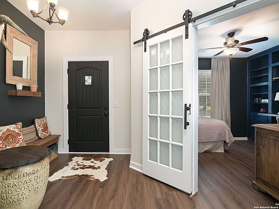 Magazine-worthy style meets everyday comfort in this single-story home in Fairways at Scenic Hills. Offering 3 bedrooms, 2 baths, a private study with barn doors, dining room, and open floor plan, this home is updated and move-in ready. The remodeled kitchen features a farmhouse sink, quartz island with seating, subway tile, butcher block counters, stainless appliances, and extra cabinetry. Split primary suite with custom closet, soaking tub, separate shower, and new decorative tile. Laminate flooring throughout (no carpet), plantation shutters, and updated fixtures. Enjoy privacy with no neighbors behind-backing to greenspace and trails. Covered patio with fans, flagstone seating, privacy wall, and mature trees. Recent roof, new plumbing (warranty), foundation repair (engineering letter), new fence, and solar screens. Two-car garage with sink, workbench, and shelving. Convenient to I-35, Randolph AFB, The Forum, shopping, hospitals, New Braunfels, and San Antonio/Austin airports. Zoned Comal ISD