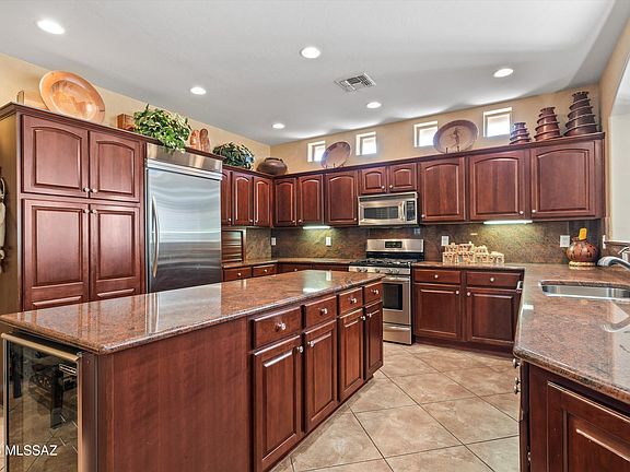 A private courtyard welcomes you to this sought-after Cimarron model, styled with southwest accents. The home includes three bedrooms--one being a secluded guest Casita--three bathrooms, and a beautifully designed den equipped with built-ins and a wall bed. An expansive great room opens to inviting outdoor living and entertaining areas. The island kitchen features elegant dark wood cabinetry, providing ample storage and workspace. The spacious primary suite boasts an en-suite bathroom with double vanities, a large tiled shower, and a roomy walk-in closet. This exceptional residence includes a main house guest bedroom and bathroom, a two-car garage, and an additional third-car garage with storage space. The extended flagstone patio featuring a kiva fireplace offers privacy and comfort, while the expansive side yard is equipped with a built-in gas BBQ and ample space for a pool. A serene area overlooking mountain views provides an ideal setting for entertaining or enjoying the distinguished SaddleBrooke lifestyle.