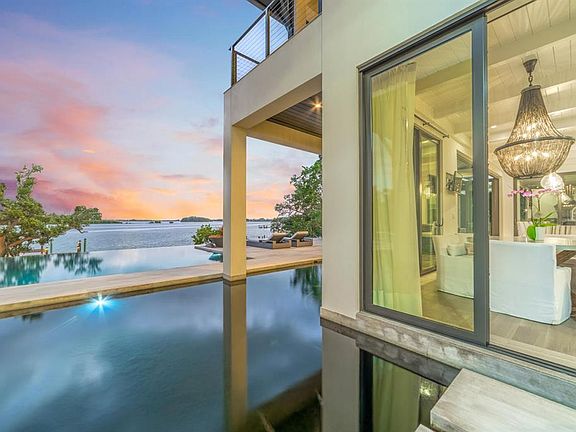 Relax and take in the positive energy of Lotus-style living in this one-of-a-kind Balinese-inspired resort compound on north end of the world-famous Siesta Key. Nothing is needed to begin your Zen journey as the property comes completely furnished down to dishes, silverware and a Buddha living wall. The coexistence of indoor and outdoor space blends over 8,000 square feet of indoor space with thousands of square feet of patio and pool area. An outdoor oasis offering an infinity-edge pool with a swim-up bar, a sunken fire pit lounge within the pool, a spa, an outdoor kitchen, a dining pavilion with a living plant wall and an open-air living room with a fireplace. A koi pond with stunning built-in footbridges stretches nearly the entire length of the home, enhancing the serene ambiance of the outdoor space. Spanning over an acre with more than 700 feet of waterfront, the property is a masterpiece of luxury, designed for effortless relaxed living or island-style entertaining. A custom-designed driveway welcomes you to a breathtaking entrance, where waterfalls and fire features set the tone for the experience that awaits inside. Expansive walls of glass, seamless indoor-outdoor transitions, and rich wood and stone flooring throughout create a striking, cohesive aesthetic. The thoughtfully designed interior boasts multiple living spaces, including a game room, home theater, fitness room, meditation space and an impressive 8-plus-car garage. For the waterfront enthusiast, a well-equipped boat dock, a separate waterfront garage, and a paddleboard/canoe launch provide unparalleled access to pristine waters. This exceptional residence also features a newer seawall, full-house generator, Crestron home automation, a three-stop elevator and a whole-house reverse-osmosis water filtration system, ensuring convenience and peace of mind. An island paradise, this estate offers unmatched privacy while remaining just moments from Sarasota’s vibrant shopping, dining and world-renowned cultural attractions. Don’t miss this rare opportunity to own a move-in-ready masterpiece on Siesta Key – home to the #1 beach in the USA (Tripadvisor).