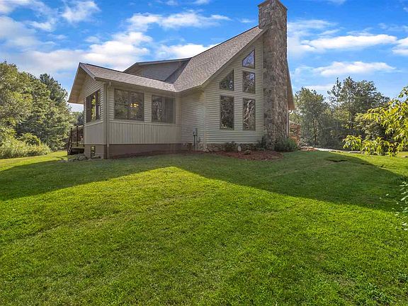 This custom built; one owner home is a secluded gem on 10 acres in an area of Quality Deer Management neighbors! It is a half of a mile from the golf course and it has been extremely well maintained and has many updates! New roof in 2019, new central air in 2018, updated appliances with wall oven, 5 burner cooktop and granite countertops in 2018. It has super-efficient hydronic, in floor radiant heat system through out the house and garage with a new natural gas boiler in 2011. It also has on demand hot water system, Brazilian teak flooring on main floor, breathtaking 26' cathedral ceiling done in knotty pine and with floor to ceiling stone gas log fireplace!! Large master suite is something to behold!! Walk in cedar closet, dual head walk in shower, large soaking tub and dual vanities. There are two bedrooms on the main floor with custom blinds and organized closet space. The dining room has windows on three sides allowing you to watch the wildlife as you enjoy your morning coffee. You will enjoy the 3 plus car garage with heated, epoxy finished floor, hot and cold-water supply and offers a direct access to the basement workshop. Windows are Anderson 400 series high efficient windows. One of the first things that will catch your eye is the custom entry door and side lights, absolutely beautiful!! Basement is half finished with a family room and offers a potential 4th bedroom and has a large workshop. The house is extremely well insulated and has sound proofing through out! The 24 x 40 pole barn with cement floor and electric is the perfect place to store your toys and equipment for maintaining the food plot and fenced in garden!! This house is absolutely beautiful and can only really be totally appreciated if you see it first-hand!!! Book your appointment now to see this stunning home!