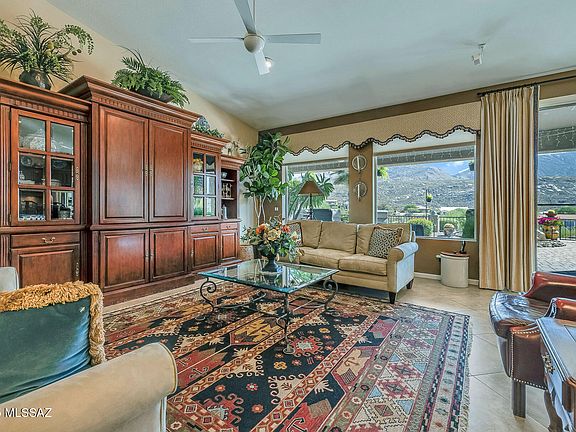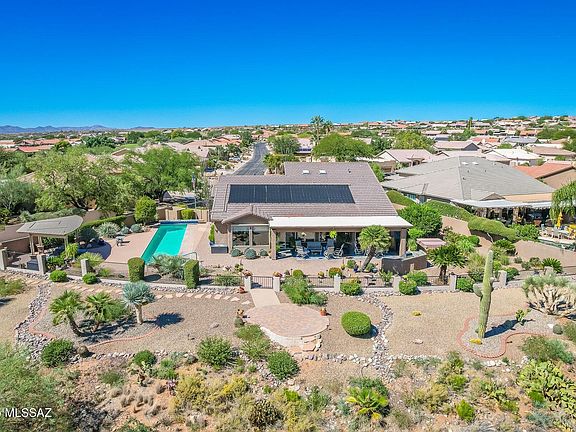 SPECTACULAR DESERT LIVING at SaddleBrooke's Premiere Active Adult Community. This phenomenal property ideally situated for maximum privacy boasts uncompromising GOLF COURSE and CATALINA MOUNTAIN VIEWS. Large RESORT STYLE YARD boasts a Solar-heated LAP POOL with remote cover, private HOT TUB, Outdoor Kitchen, covered & uncovered paver patios including a shaded Pergola Patio with propane Kiva Fireplace, and even a Greenhouse. Extensively Updated two-story home offers a main level Owner's Suite and Office plus two upper Guest Rooms with updated hall bath. This elegant 3,311 sq ft residence welcomes you with a paver driveway & courtyard plus gated front porch. Formal & informal living spaces off foyer are highlighted by soaring, vaulted ceilings, plantation shutters, bay windows and rolling sunscreens off kitchen & family room. Updated Gourmet Kitchen boasts center island, custom wood cabinetry, Granite countertops, Stainless appliances including gas cooktop, Advantium oven/microwave plus dual ovens. Spacious Owner's Suite off rear patio hosts dual walk-in closets, dual sink vanity, air bubble soaking tub and separate walk-in shower. Additional updates to Office, Powder & Laundry rooms, built-in buffet off Kitchen, gas fireplace in Living Room and so much more! Extended 3-car garage offers utility sink, storage cabinets & overhead rack plus workshop area. Tranquil rear yard is professionally landscaped with mature desert plantings, flowering shrubs and citrus trees to one side while a wrought iron fence allows you to partake of the magnificent views without sacrificing privacy! Full Property Improvements List available.