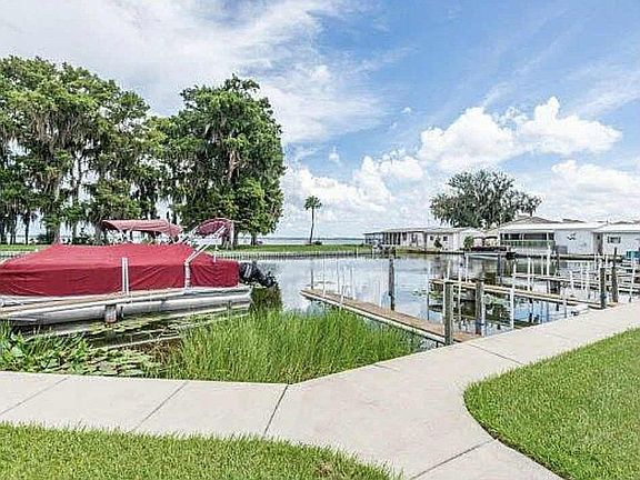 Snowbird's delight or enjoy the rest of your life in your new home. Location, location, location is your key to your dream home 55 resort style community of Lake Point with a view Lake Eustis with access to the Harris chain of lakes. Amenities include a clubhouse, swimming pool and much more! This park model home offers two bedrooms with large bathroom. Modern kitchen has stove, refrigerator and microwave with inside washer/dryer. The living room offers tray ceilings and crown molding. This home has a welcoming front porch with the breeze and view of the water and a large carport with a back porch under carport with two seat rocking couch. Storage shed is is attached to carport. Home is ready to move in just bring your boat and toothbrush! Both rooms have beds and dressers, large closets. Kitchen is completely equipped as is the living room with furniture and large flat screen tv mounted on the wall above modern electric fireplace cabinet, remote ceiling fans throughout. Pets any size are welcome. The community has a marina. Enjoy championship fishing or just enjoy the boat ride in the Harris chain of lakes. Our elite park requires an approved application and background screening.