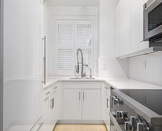 A welcoming foyer with a coat closet flows past a windowed galley kitchen and into a spacious living and dining area saturated with southern light. Gorgeous hardwood floors complement classic sash windows and built-in bookshelves and cupboards. The lovely wood-burning fireplace adds character and charm and is especially luxurious during cool fall and winter nights. The kitchen has eastern exposure and is equipped with custom white lacquer cabinets, sleek white countertops and backsplash, and high-end stainless steel appliances including an eco-friendly induction stove.
