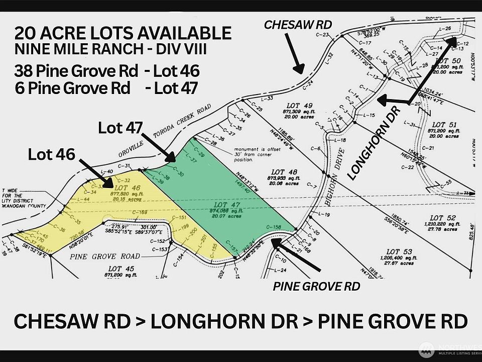 Build your dream home on two adjacent lots totaling 40 acres in Nine Mile Ranch, conveniently located near the Canadian border with power available at the road. Experience the region's abundant wildlife while camping, enjoying recreational activities, or simply relaxing on a quiet getaway. The property allows for an Accessory Dwelling Unit (ADU), Manufactured Homes, and RVs - please refer to the Covenants, Conditions, and Restrictions (CCRs) for details. Also see individual listings for each 20-acre Lot #46 38 Pine Grove Rd (MLS 2455037 - 4 parcels) & Lot #47-6 Pine Grove Rd (MLS 2455052 - 4 parcels). HOA is $351 annually per lot, includes road maintenance.