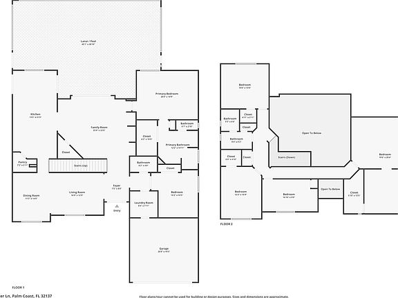 Discover this magnificent 3,957 sq. ft. residence in the heart of the desirable Indian Trails subdivision, featuring 6 bedrooms and 3 full bathrooms—perfectly designed for multi-generational living. From the moment you enter, you’ll be captivated by the dramatic 20-foot ceilings and unique architectural details throughout. The main level offers exceptional comfort and versatility, featuring a formal living room, dining area, and a spacious family room with triple sliders that fully open to the lanai, creating a seamless indoor-outdoor flow ideal for hosting and entertaining. The open-concept floor plan is enhanced by newly installed luxury ceramic tile flooring throughout the first floor. The fully remodeled kitchen is a chef’s delight, showcasing soft-close cabinetry, top-of-the-line stainless steel LG appliances, a built-in oven, cooktop, and a Samsung refrigerator. A separate eat-in kitchen space provides the perfect spot for casual dining or your morning coffee. The Primary Suite on the main level offers a large walk-in closet and a beautifully renovated bath featuring a double-sink vanity, walk-in shower, and soaking garden tub, creating a luxurious spa-like retreat. A second bedroom is also conveniently located on the first floor, ideal for guests or multi-generational living. Upstairs, enjoy a versatile layout designed for comfort and privacy. One spacious bedroom includes its own private sitting area, creating the feel of a second primary suite, along with three additional sized bedrooms with one including an efficiency kitchenette—complete with refrigerator, microwave, and dining area—for added flexibility. The grand dual-entry staircase provides an impressive transition between levels, and the brand-new carpeting (installed 2024) adds warmth and comfort throughout the upper floor. Energy efficiency abounds with a new roof (2023) and solar panels (2023)—paid off at closing—keeping average electric costs impressively low (estimated $80–$250/month). Step outside to your private backyard oasis on an oversized lot, featuring a blue sparkling chlorine pool with a new pump, safety pool fence guard, large covered and screened-in patio, fully vinyl-fenced yard, oversized storage shed, and beautiful triple sliding doors that invite the outdoors in for effortless Florida-style living. 1 photo virtually staged. Buyer to verify all measurements and details