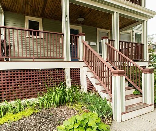 This lovely unit, w/wood flrs, high ceilings, & AC, has an open floor plan w/lots of light. There is a nook to the left of the entry w/a stained glass window, skylights, & room to sit. To the right is the 1st BR w/a lg double closet. The 2nd BR next to that is a slight "L" shape w/2 closets--one w/original built in drawers, & a pull down staircase to the attic, offering excl rights to expand. Continuing down the hall, the full BA is on the left & incls tiled flr, bath/shower, lg linen closet, & W/D. Past that is the open DR/LR w/the kitchen to the left that has a tiled fl, quartz counters, SS appl, wood cabs, & lofted ceiling. There is another nook by the staircase that leads to the bsmnt & 1 unobstructed pkg spot. Addtl prvt storage is in the bsmnt. This unit has access to the front prch on the 2nd flr & is shared 50/50 w/unit 2. This condo is near the Armory, Porter & Union Sqs, & bus rts 88/90/85. By car Rts 93, 28, 38, 16, 2, 95, 90, & Logan are nearby.