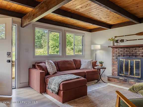Welcome to Alpine Cabin, your dream mountain getaway! Nestled just steps away from the slopes, this charming cabin combines rustic elegance with modern comforts perfect for a cozy winter retreat or an adventurous alpine escape. Situated at the base of the Windham Mountain Club with views of the slopes beyond, and just 130 miles from New York City. The fireplace in the living area is perfect for apres-ski relaxation. Step outside to the expansive wrap around deck with a fire pit and stunning views of the surrounding mountains. Wood ceilings throughout the house create the perfect cabin feeling. Two bedrooms and a bathroom are situated on the main level off the open floor plan entertaining area. The second floor is divided by a central staircase. On one side a sleeping area features two full beds, the other side is a seating area with a full bathroom. The upstairs features the original wood vaulted ceilings and wood floors. Nestled in a prime location at the base of Windham, this ski house offers easy access to world-class skiing, hiking, and year-round outdoor activities.
