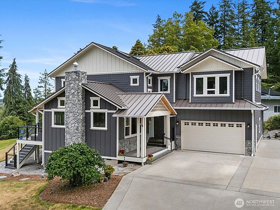 Exquisite custom built dream home w/ incredible Views on a large sprawling corner lot! Northwest Lifestyle meets sweeping views - Utsalady Bay, Mt Baker, Whidbey Island, migrating Gray whales & breath-taking SUNSETS. Spectacular finishes throughout wood, slate & stone inspired by local artist. 4 Bedrooms +main floor Den w/ Closet +extra Finished Room +Bonus Room. Slate Entry, vaulted ceiling Living Room & Great Room +Bonus Room, 2 cozy gas fireplaces, expansive covered Deck, Backyard & Patio. Spacious Primary Suite w/ sumptuous bath, soaking tub w/ view & stone shower. Tall 3-car garage, generator wired. Huge 1100sqft insulated crawl space w/ 7’ ceilings & concrete floor. Paved RV pkg space w/ power & dump. Don't miss this spectacular home.