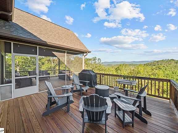 Welcome to your private escape in a gated community, perfectly situated on a quiet cul-de-sac lot with gorgeous mountain views and a wooded backdrop. This beautifully designed home provides the convenience of single-level living paired with the flexibility of an unfinished walkout basement (plumbed for a bathroom) ideal for future expansion, hobbies, or storage. Step inside and you’ll be greeted by mountain views out the back windows, soaring 9+ ft ceilings, ceiling accents, and an open floor plan that seamlessly blends elegance and comfort. In the chef’s kitchen enjoy the granite countertops, a walk-in pantry, and abundant workspace, opening to a light-filled living area where ceiling fans, custom window treatments, and a cozy flow make entertaining effortless.The primary suite is a true retreat with a spacious walk-in closet, 2 separate vanity sinks, garden tub, and separate shower designed for relaxation at day’s end. Additional highlights include a dedicated office/study, dining room (currently being used as a hobby room) laundry room, custom closets throughout and disappearing attic stairs for even more storage. Outdoor living shines here with multiple spaces to unwind: screened deck, open deck, and massive patio overlooking the fenced backyard and wooded mountain views and a covered rocking chair front porch. This property combines everyday functionality with mountain tranquility—perfect for those seeking peace, privacy, and space to grow. Just an 8 minute drive to downtown Travelers Rest, don’t miss your chance to own this one-of-a-kind gem!