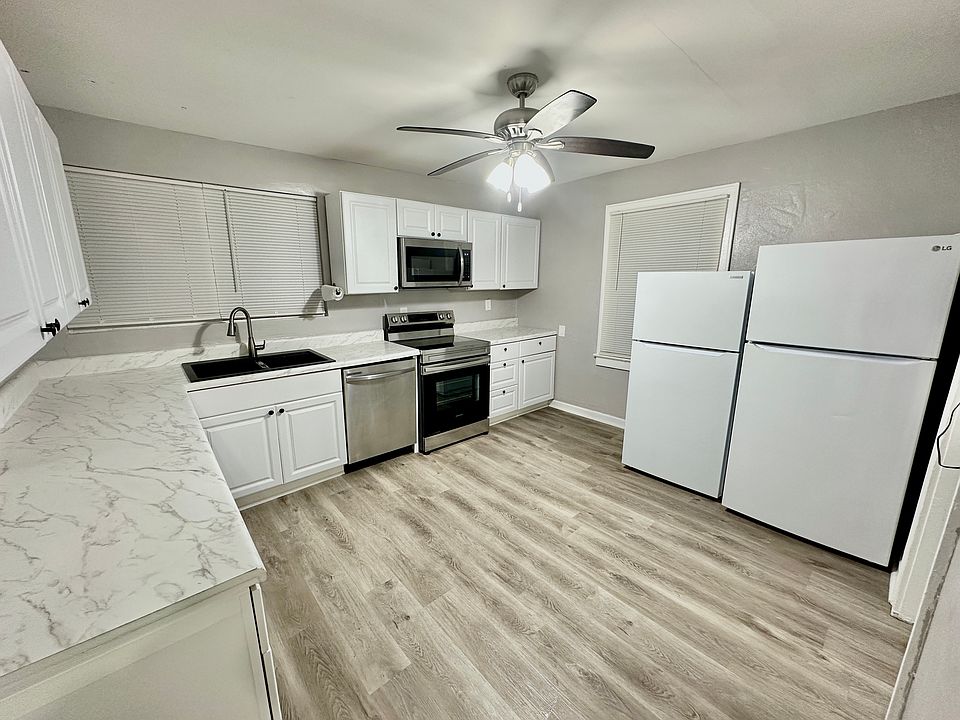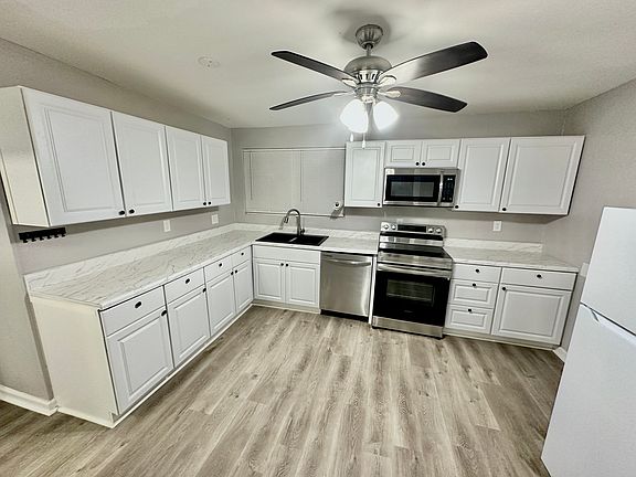 Detached garageStainless appliancesBright white cabinetsNew plank flooringNew tub and surroundFresh paintNew hvac system