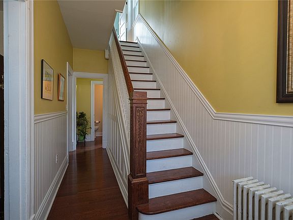 Move into a lovingly cared for old world charming home with all of the modern conveniences. Large front porch perfect for cozy evenings or entertaining leads into the entry with a beautiful open stair case. Dining and living room are interchangeable boasting decorative fireplaces, built in cabinets and book shelves. You don't have to cook to enjoy the spacious beautifully designed kitchen flooded with natural light from high soaring windows and lighting everywhere you need it, plenty of cabinets, granite counter tops and a large pantry. Most rooms have been thoughtfully painted with serene colors throughout the home. Second floor boasts two spacious bedrooms with an updated hall bath. The third floor (with separate thermostat) has knotty pine floors, again flooded with light, has a large room (bedroom) which leads into a smaller room perfect to use as a den, doll room or gaming room and a large walk in closet. New windows, deck and roof! Must see.