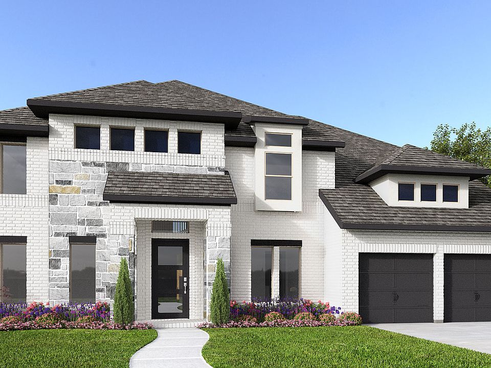 Curved staircase highlights two-story entry. Hardwood floors throughout living areas. Home office with French doors and formal dining room set at entry. Two-story family room with a decorative beamed ceiling, sliding glass door, and a wood mantel fireplace opens to kitchen and morning area. Kitchen features walk-in pantry and island with built-in seating space. First-floor primary suite with wall of windows. Dual vanities, freestanding tub, separate glass-enclosed shower and two walk-in closets in primary bath. First-floor guest suite offers private bath. A game room, media room and three secondary bedrooms are upstairs. Extended covered backyard patio. Three-car garage. Representative Images. Features and specifications may vary by community.