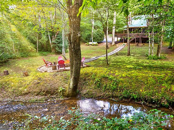 Situated along the peaceful banks of Sugar Creek-one of Fannin County's designated trout streams-this charming 2-bedroom, 2-bath cabin marries rustic allure with contemporary comfort. Imagine sipping your morning coffee as sunlight dances on cathedral ceilings, then slipping into the hot tub to the gentle murmur of the creek. A screened-in porch off the master suite provides a serene spot for stargazing or enjoying the woodland scents, while an adjacent extra-wooded lot ensures privacy and seclusion. Inside, newly installed kitchen countertops and bathroom vanities add a fresh, contemporary touch to the cabin-chic dcor. Just under five miles from the vibrant shops, galleries, and eateries of downtown Blue Ridge, you're perfectly positioned to explore local attractions-yet at your cabin, you'll feel worlds away. Whether you're casting a line for trout, unwinding by the fire pit, or simply soaking in the peaceful surroundings, this creek-front gem delivers an unforgettable mountain experience. Fully furnished and turnkey, this vacation rental home has verifiable rental history, presenting a seamless opportunity for both personal retreat and steady income.