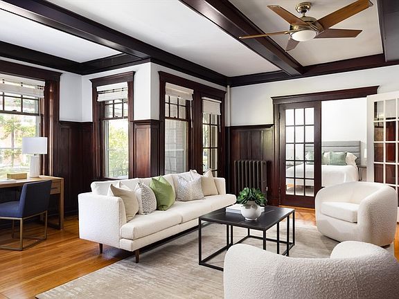 This charming floor through unit is set in a handsome brick building superbly located on Aspinwall Hill near vibrant Washington Square. It offers a wonderful floor plan for today's living with four bedrooms and two and one-half bathrooms. Highlights include a living room with a grand fireplace, beautiful detail, high ceiling, and French door out to the porch; a gracious dining room with a fireplace and built-ins; and a modern, eat-in kitchen. Amenities such as in-unit laundry, air-conditioning, private storage, parking, and common outdoor patio area add to its appeal. The building is well maintained, and shops, restaurants, and the "T" are all easily accessible.