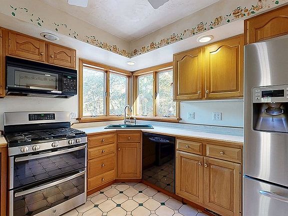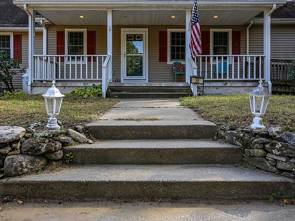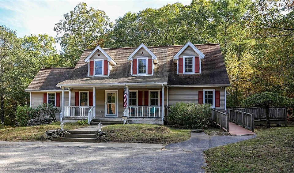 A welcoming farmers porch brings classic New England charm to this spacious cape set on 6.5 private acres. The main level offers an open floor plan with hardwood floors, a sun drenched living room leading to a large, low-maintenance deck overlooking the spacious yard and peaceful, wooded landscape, and a first-floor oversized bedroom suite with a ceiling lift system, fully accessible bath with tub and shower, exterior access with ramp to driveway and elevator to garage for added accessibility. The kitchen offers a large dining area, and includes a half bath and access to the deck. Upstairs are an expansive bedroom, a smaller bedroom and a full bath. The detached heated garage for 2+ cars features an additional full bath—ideal for a workshop or studio. Metal carport. Home could use cosmetic updates and has evidence of smoke odor, but offers a solid layout, private setting, and room to make it your own. New septic 2021. Priced based on condition. Open House Saturday, Oct 11, 2:00 - 3:30