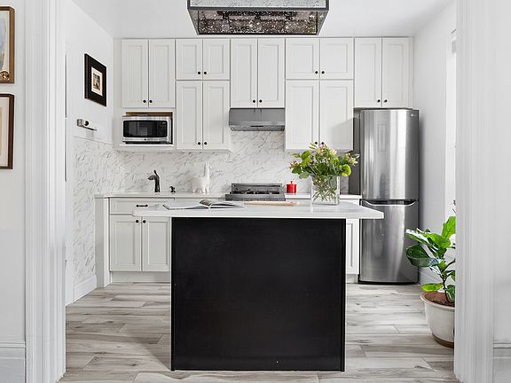 Impeccably and thoughtfully renovated open kitchen with quartz countertop, floor to ceiling cabinets, 34" x 51" kitchen island with additional storage, and wine fridge. Appliances include Bosch dishwasher, Bertazzoni stove with range hood, LG fridge, and microwave.