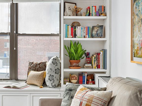 High ceilings, hardwood floors, 2 walk-in closets, and built-in bookshelves with storage bench.